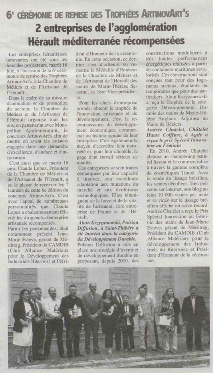 Pour la société Everlia, obtenir le trophée artinovart’s de l’innovation artisanale et du développement durable, c’est la reconnaissance économique, commerciale ou technologique de l’entreprise. C’est également le moyen d’accroître la notoriété et pour la clientèle, le gage d’un travail sérieux de qualité. C’est ainsi que ce mardi 18 juin, Claude Lopez, Président de la Chambre de Métiers et de l’Artisanat de l’Hérault, a eu le plaisir de recevoir 7 lauréats de cette 6è édition du concours ArtinovArt’s.
