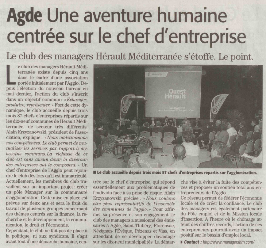 La CCI de Béziers rencontre les entreprises et partenaires du bassin agathois. Alain KRZYZANOWSKI, Président du club des Managers Hérault Méditerranée était présent. Le club des Managers est partenaire du Pôle Emploi et de la mission locale et compte 87 chefs d’entreprises réparties sur les dix-neuf communes de l’Hérault Méditerranée depuis l’élection de la nouvelle présidence.