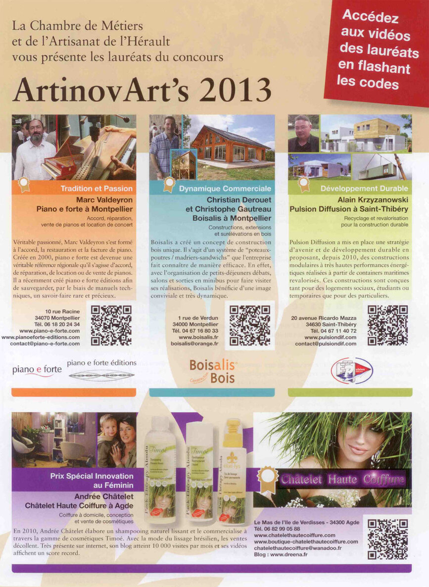 La CMA, Chambre de Métiers et de l’Artisanat, de l’Hérault vous présente les lauréats du concours Artinovart’s 2013 : La société Everlia sélectionnée pour le développement durable. Ces constructions sont conçues tant pour des logements sociaux, étudiants ou saisonniers que pour des particuliers.